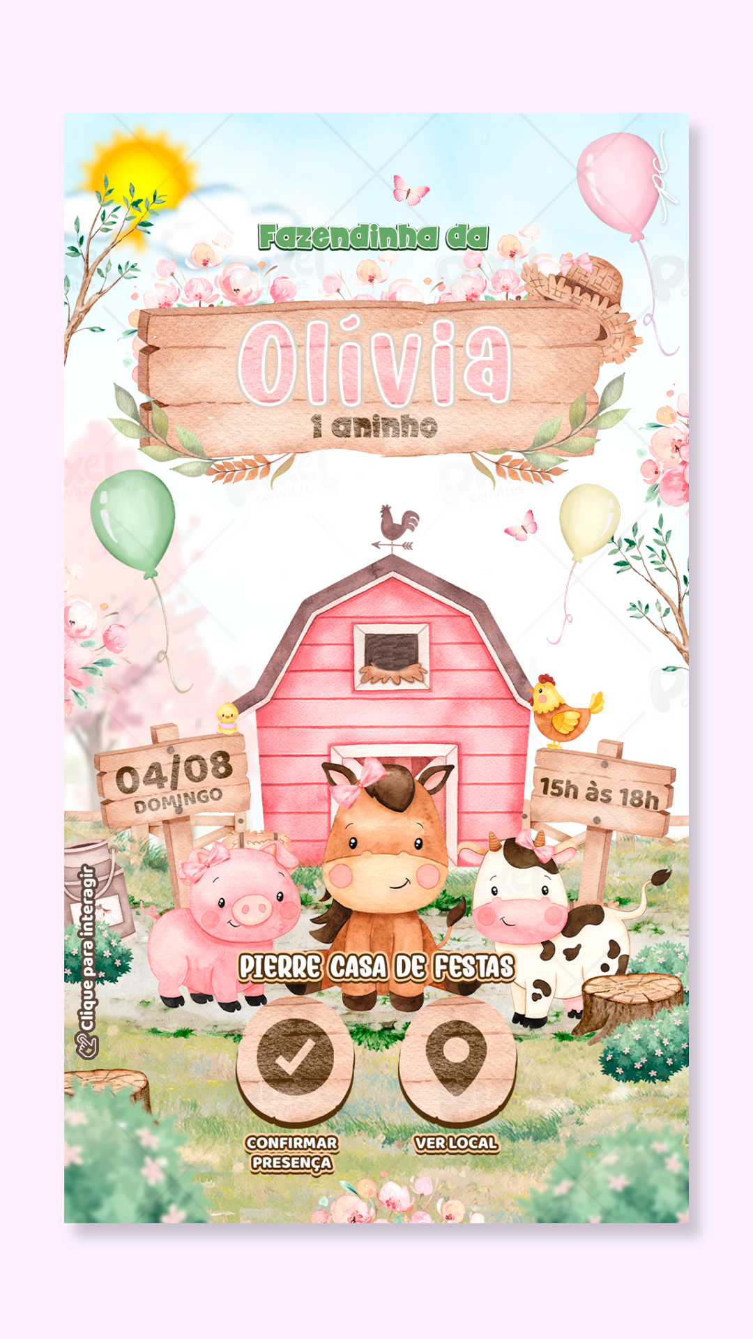 Convite Interativo Fazendinha Rosa Aquarela